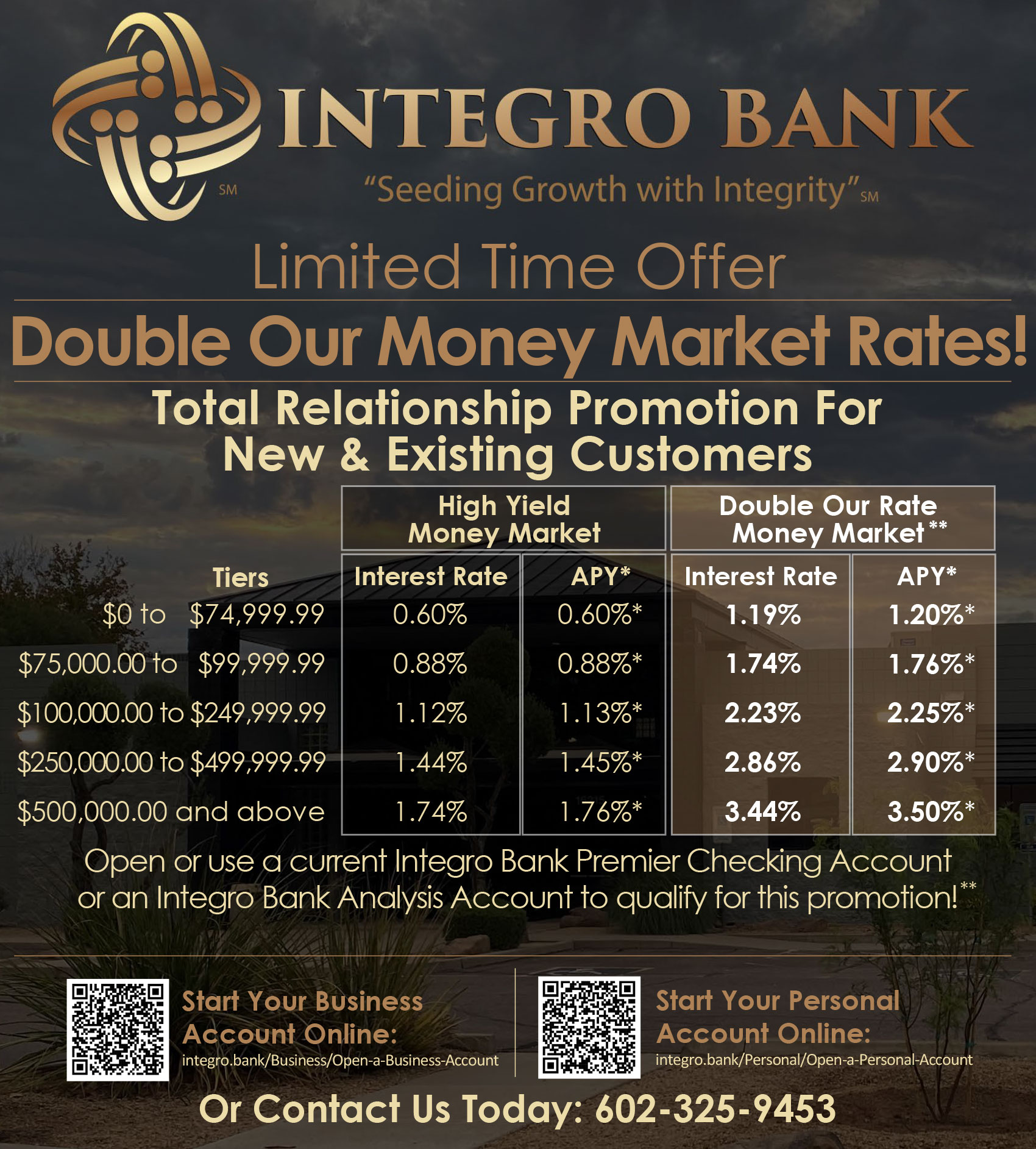 ** To qualify for the Double Our Rate Money Market Account rate promotion, open, or use an existing, Integro Bank Premier Checking Account or an Integro Bank Analysis Account. Analysis Accounts with sweep services do not qualify. Existing Special Rate does not qualify for the promotion. If the Premier Checking Account or Analysis accounts are closed the Double Our Rate Money Market will revert to the current High Yield Money Market APY in effect. Integro Bank reserves the right to discontinue this promotion at any time. A minimum deposit of $100.00 is required to open a Double Our Rate Money Market Account.